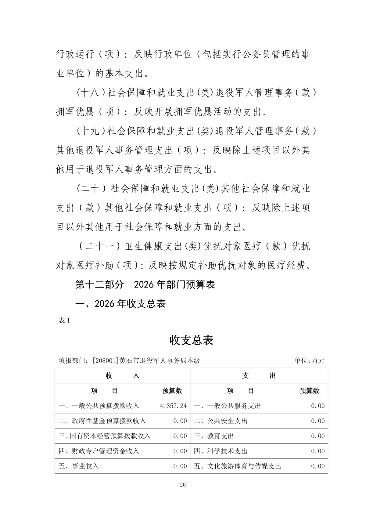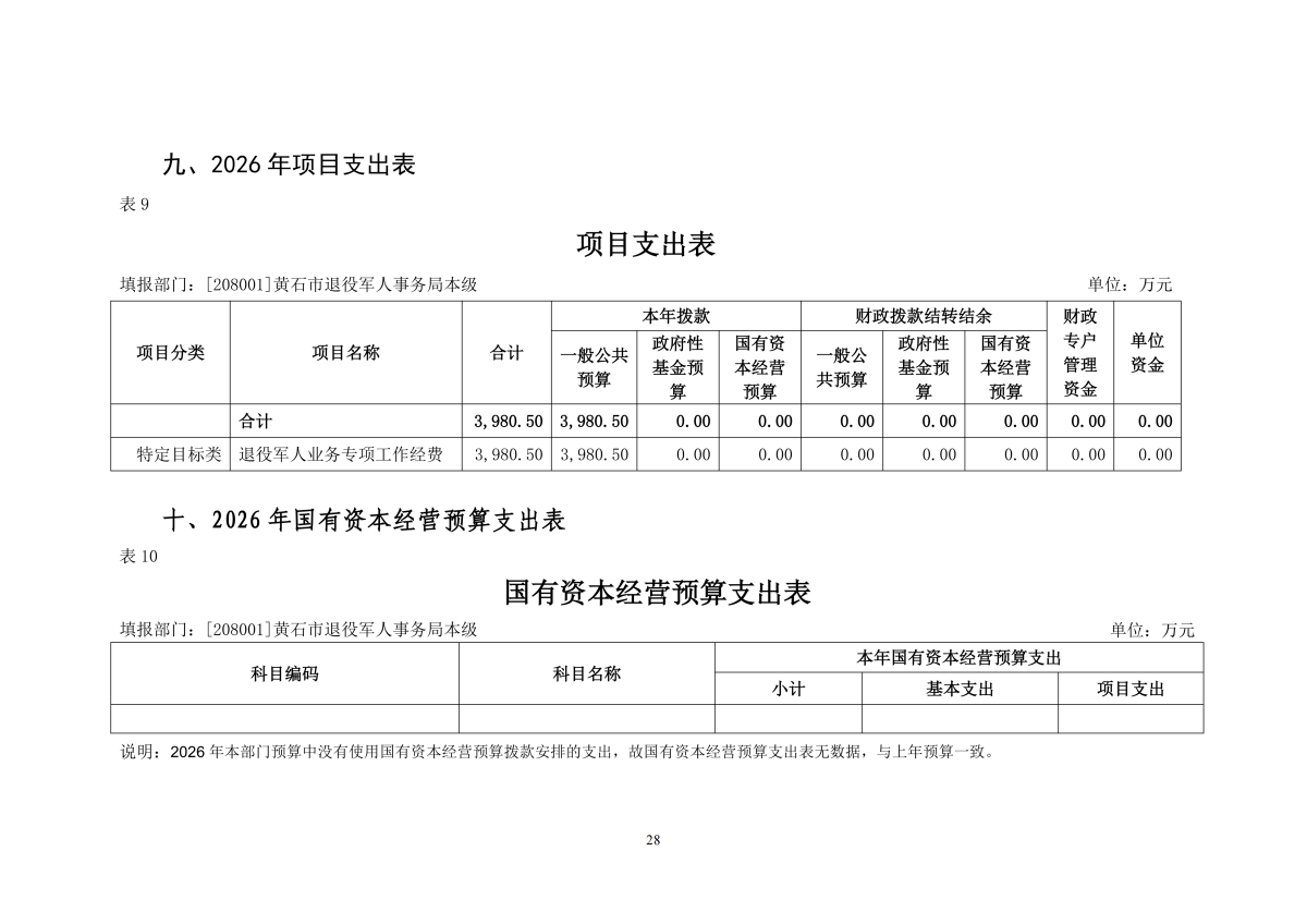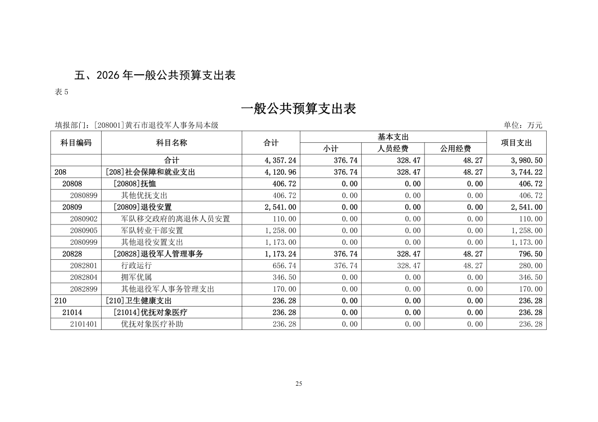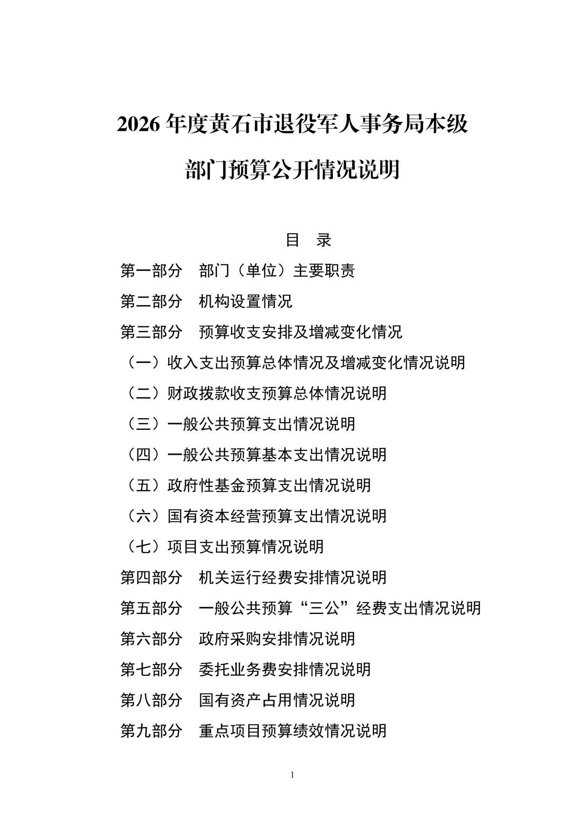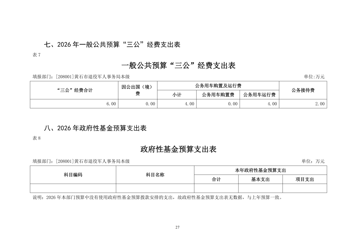 2026年度黄石市退役军人事务局本级部门预算公开情况说明