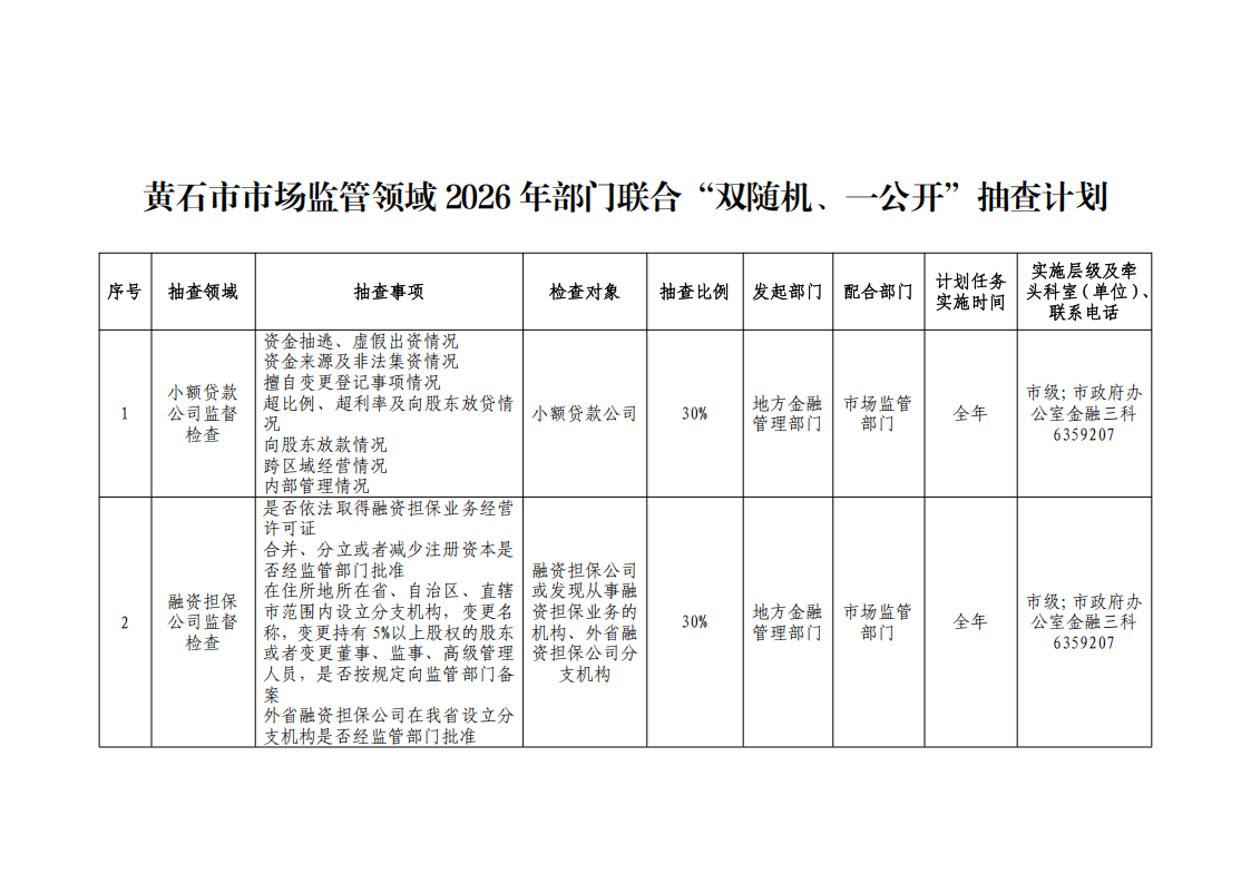 为进一步规范涉企行政检查,打造一流法治化营商环境,按照《国务院办公厅关于严格规范涉企行政检查的意见》(国办发〔2024〕54号)、《市场监管总局关于全面深化“双随机、一公开”监管规范涉企行政检查服务高质量发展的意见》(国市监信规〔2024〕5号)及《省市场监管局关于印发湖北省市场监管领域2026年度部门联合双随机抽查工作计划的通知》(鄂市监信监〔2026〕6号)要求,结合本地实际,现将《黄石市市场监管领域2026年部门联合“双随机、一公开”抽查计划》印发给你们,并就相关事项通知如下: