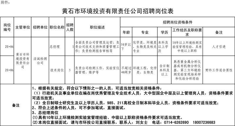黄石市环境投资有限责任公司(以下简称公司)系黄石市城市发展投资集团有限公司所属单位,组建于2016年10月。主要负责黄石市水、土、气环境治理项目的融资、投资及运行管理。注册资本2亿元,现有在册职工140人。黄石市环投公司下辖黄石环投污水公司、洁城检测公司等直属单位,出资参股市环投蓝德再生能源有限公司、市智慧环保科技有限公司等企业。因公司事业发展需要,公司下属单位洁城检测公司现面向社会引进总经理1名,公开招聘工作人员5名。一经录用,待遇从优。