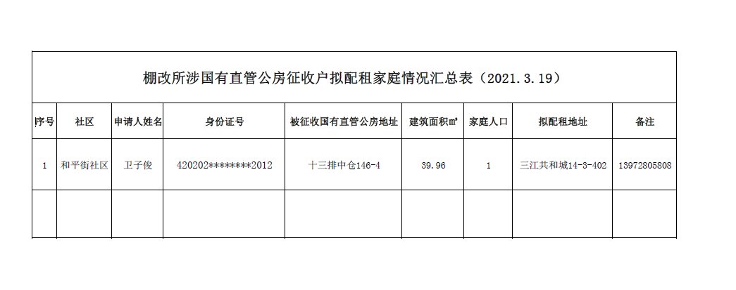 经西塞山区国有直管公房棚改征收户申请、所在社区受理、城区住房保障和民政部门初审、入户调查和市住房保障部门复审,截止2021年3月18日有1户国有直管公房棚改征收家庭符合公共租赁住房实物配租条件,根据《关于规范国有直管公房住房管理的实施意见》(黄政办发〔2018〕22号)的规定,拟视公租房房源情况,予以轮候配租(详见棚改所涉国有直管公房征收户拟配租家庭情况汇总表)。