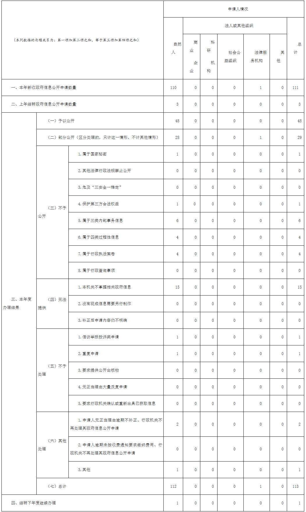 2025年,全县各机关单位共新增收到政府信息公开申请111件,上一年度转结办理3件,均依法依规在法定期限内完成答复,转结下一年度办理1件。