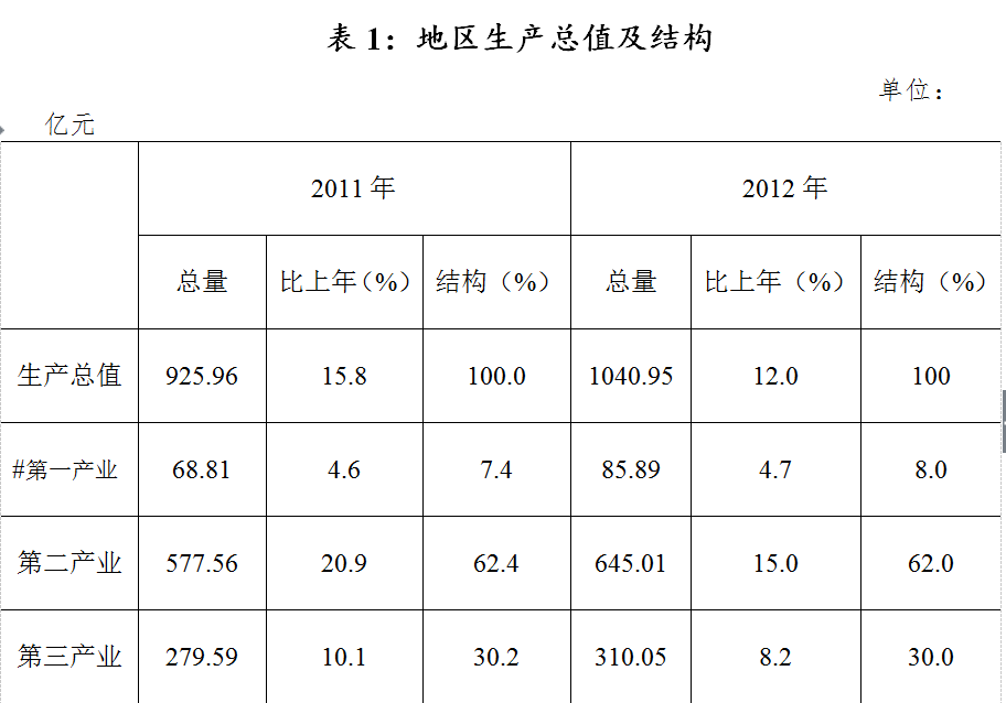 初步核算,2012年地区生产总值(GDP)1040.95亿元,按可比价格计算,比上年增长12.0%。其中,第一产业增加值85.89亿元,增长4.7%;第二产业增加值645.01亿元,增长15.0%;第三产业增加值310.05亿元,增长8.2%。三次产业比重为8:62:30,与2011年比,第一产业增加值占GDP比重上升0.6个百分点,第二产业增加值占GDP比重下降0.4个百分点,第三产业增加值占GDP比重下降0.2个百分点。
