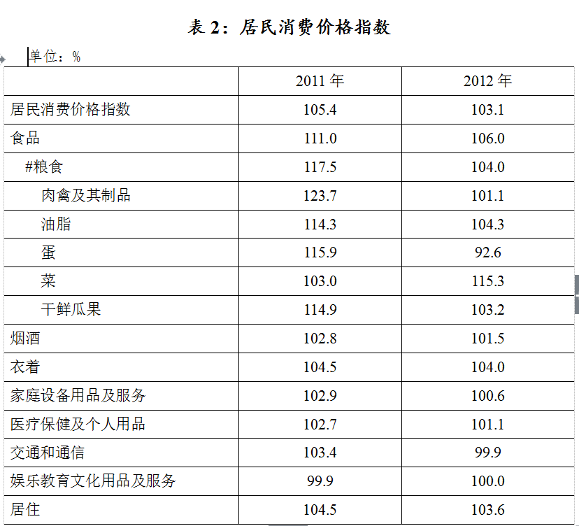 全年居民消费价格总指数(CPI)103.1%,价格水平比上年上涨3.1%。在居民消费的八大类别中,食品、烟酒、衣着、家庭设备用品及维修服务、医疗保健和个人用品、居住价格与2011年比分别上涨6.0%、1.5%、4.0%、0.6%、1.1%、3.6%;交通和通信价格下跌0.1%,娱乐教育文化用品及服务类价格不变。全年工业生产者出厂价格(PPI)下降8.5%,工业生产者购进价格下降7.3%。