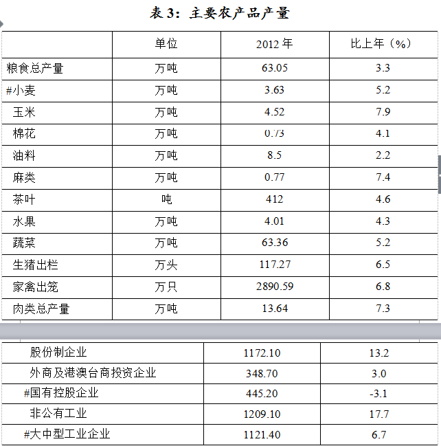 主要农产品产量均保持增长。粮食总产量63.05万吨,增长3.3%;水产品产量19.26万吨,增长6.9%;肉类总产量13.64万吨,增长7.3%。