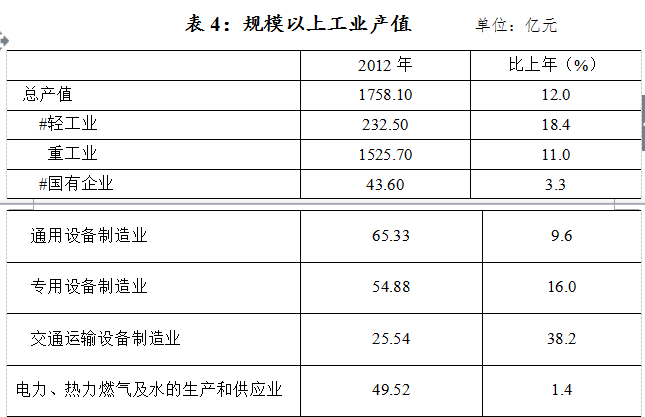 2012年全市全部工业增加值581.91亿元,比上年增长15.8%。其中,规模以上工业完成增加值537.64亿元,按可比价格计算,增长16.6%。