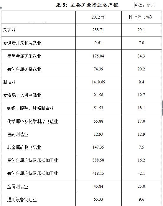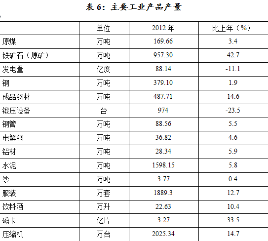 从主要行业看,有色金属冶炼及压延加工业完成工业产值418.15亿元,同比下降2.1%;黑色金属冶炼及压延加工业产值388.58亿元,增长16.2%;电力行业产值49.52亿元,增长1.4%;非金属矿物制品业产值147.35亿元,增长7.5%;机械设备制造业145.75亿元,增长16.2%。
