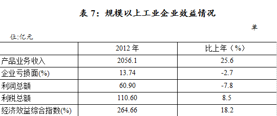 2012年全市规模以上工业经济效益指数264.66%,同比提高18.16点。实现利润60.9亿元,下降7.8%;工业品出口交货值60.2亿元,下降3.7%。