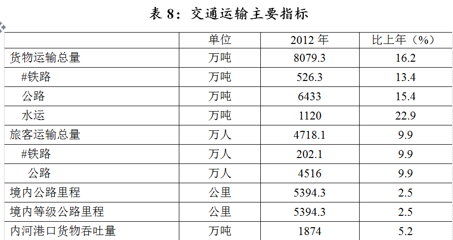 2012年全年完成旅客运输量4718.1万人次,比上年增长9.9%。其中,铁路发送旅客202.1万人次,增长9.9%;公路发送旅客4516万人次,增长9.9%。