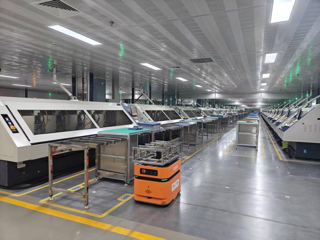 广合精密电路公司的“机器人”小车在生产车间运输电路板