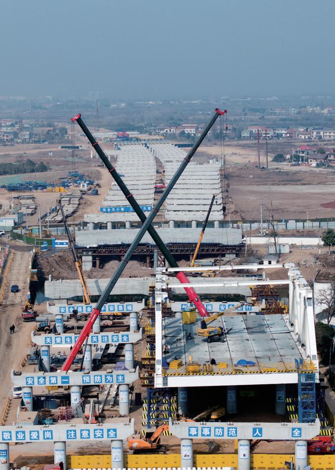 武黄高速公路改扩建项目房建工程主要包括新建“一点一区三站”(鄂州南南广场、蒲团服务区、蒲团匝道收费站、路口匝道收费站、汀祖匝道收费站),改造“一中心”(武黄高速公路监控通信分中心)。该项目路线全长约37.4公里,是湖北首个分段封闭施工的高速改扩建项目。在武黄高速改扩建全线最长的桥梁柯家墩大桥施工现场,一排排浇筑完成的桥墩伫立在长港河两岸,大型起吊设备正将首段拼接好的钢桁梁缓缓就位。