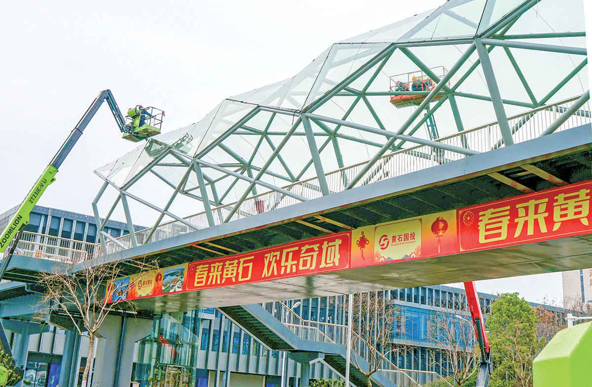 23日上午,在位于园博大道恐龙奇域与矿博园交会处的人行天桥上,施工人员依托3台38米高的曲臂式高空作业车,正在对黄石园博园提档升级改造项目的便民服务配套工程——人行天桥雨棚及玻璃幕墙进行最后的安装收尾。(瞿泽敏)