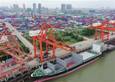 “华航汉亚2号”货轮停靠在武汉新港阳逻集装箱码头进行装箱作业(2020年5月9日摄)。 新华社发