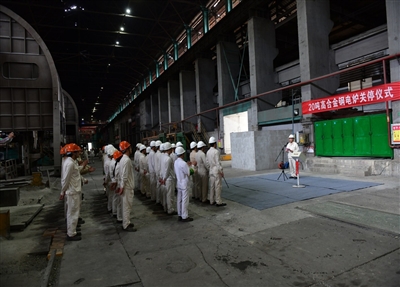 在二炼钢电炉前,大冶特钢举行简短的关停仪式,欢送劳苦功高的“功勋炉”光荣“退休”。公司总经理部、相关部门负责人和特冶厂员工一起,见证这一历史时刻。