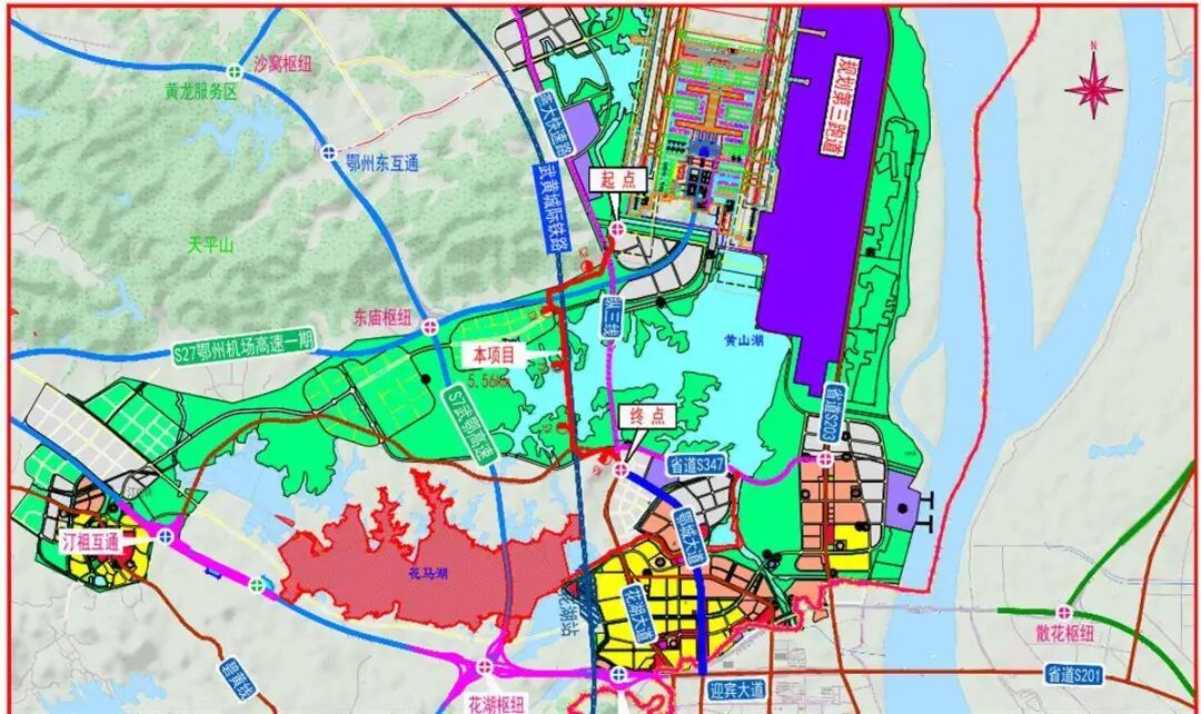 据了解,鄂州花湖机场南门连接线工程总投资约6500万元,是武鄂黄黄“横三纵三”规划“纵三”通道近期保通替代道路。项目位于鄂州市花湖镇和沙窝乡,全长约5.562公里,起于鄂州花湖机场南侧出口,向西南下穿武黄城际铁路,后跨越鄂州机场高速,沿武黄城际铁路西侧利用铁路施工便道,后向东再次下穿武黄城际铁路后沿既有汀花线改造顺接鄂城大道,与黄石市迎宾大道相接。