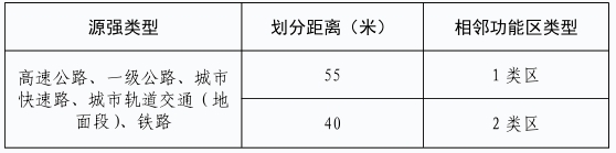 5.4类声环境功能区:交通干线两侧一定距离之内,需要防止交通噪声对周围环境产生严重影响的区域,包括 4a类和 4b类两种类型,其中高速公路、一级公路、二级公路、城市快速路、城市主干路、城市次干路、城市轨道交通(地面段)、内河航道两侧区域为 4a类,铁路干线两侧区域为 4b类;城市轨道交通(地面)场站、公交枢纽、港口站场、高速公路服务区等具有一定规模的交通服务区域为 4a类,铁路站场等具有一定规模的交通服务区域为 4b类。4a类和 4b类交通干线边界线外两侧距离的确定方法见表 2。4a类声环境功能区和 4b类声环境功能区重叠区域执行 4b类功能区。本区划实施以后,新建的交通工程及附属设施按以上条款执行。