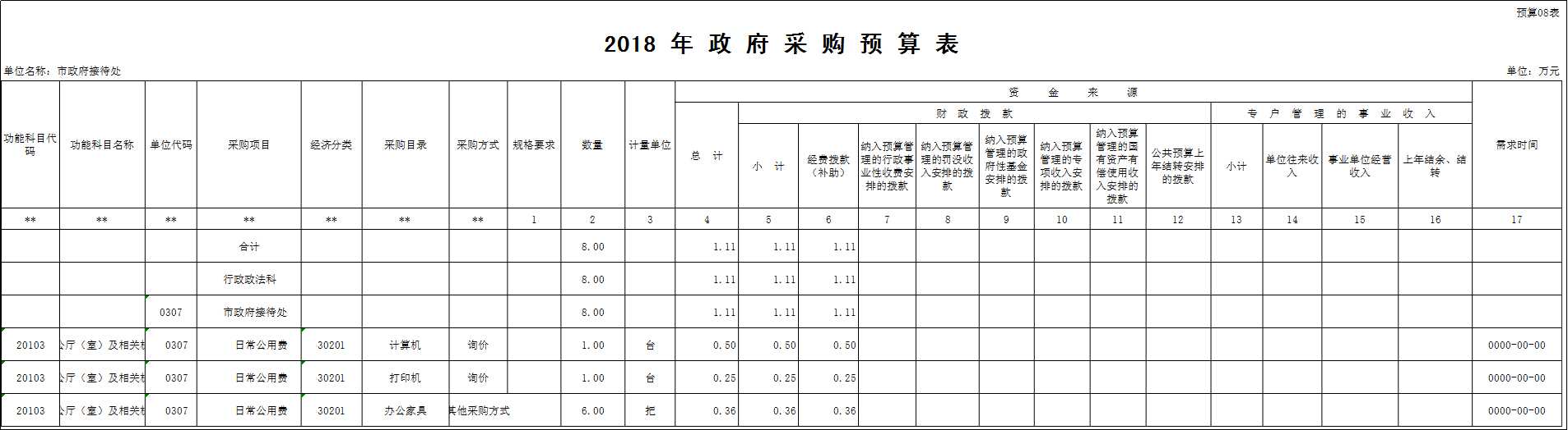 按照现行政府采购管理规定,2018年部门预算中纳入政府采购预算支出合计1.11万元,其中货物类1.11万元,在实际执行中根据计划据实调整。2018年度政府采购预算安排与2017年度相比减少0.8万元,因为上年度已基本配齐办公所需设备,今年无大型设备的采购。