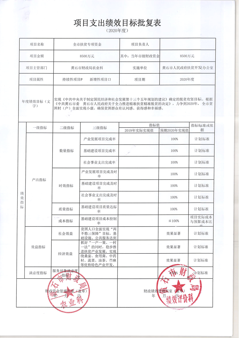 1、全市扶贫专项:为认真贯彻落实中共中央办公厅、国务院办公厅印发的《关于创新机制扎实推进农村扶贫开发工作的意见》(中办发[2013]25号)精神,消除贫困,改善民生,实现共同富裕。改革开放以来,我国扶贫开发工作取得举世瞩目的成就,走出了一条中国特色扶贫开发道路。但是,贫困地区发展滞后问题没有根本改变,贫困人口生产生活仍然十分困难。全面建成小康社会,最艰巨最繁重的任务在农村特别是在贫困地区。实现《中国农村扶贫开发纲要(2011-2020年)》(以下简称《纲要》)提出的奋斗目标,必须深入贯彻党的十八大和十八届二中、三中全会精神,全面落实习近平总书记等中央领导同志关于扶贫开发工作的一系列重要指示,进一步增强责任感和紧迫感,切实将扶贫开发工作更加重要、更为突出的位置,以改革创新为动力,着力消除体制机制障碍,增强内生动力和发展活力,加大扶贫力度,集中力量解决突出问题,加快贫困群众脱贫致富、贫困地区全面建成小康社会步伐。根据中办发〔2013〕25号 中共中央办公厅、国务院办公厅印发《关于创新机制扎实推进农村扶贫开发工作的意见》要求,针对制约贫困地区发展的瓶颈,以集中连片特殊困难地区(以下简称连片特困地区)为主战场,因地制宜,分类指导,突出重点,注重实效,继续做好整村推进、易地扶贫搬迁、以工代赈、就业促进、生态建设等工作,进一步整合力量、明确责任、明确目标,组织实施扶贫开发10项重点工作,全面带动和推进各项扶贫开发工作。黄石市财政专项扶贫资金主要用于改善贫困地区生产和生活条件,提高贫困人口生活质量和综合素质,重点要向深度贫困村倾斜。在资金安排方面,按当年地方财政收入增量的15%增列专项扶贫预算,当年清理回收可统筹使用的存量资金中的50%以上用于精准扶贫。按财政投入不得低于上年度且不低于中央、省级财政专项扶贫资金总和的80%以上投入用于精准扶贫。2018年预算安排专项资金8500万元,其中拨阳新县7545万元,拨大冶市300万元,拨开发区655万元;2019年预算安排资金8500万元,其中拨阳新县7700万元,拨大冶市500万元,拨开发区300万元。2020年保持预算8500万元不变,主要用于精准施策加强救助帮扶、多措并举全力降低疫情影响、推动“三保障”和饮水安全巩固提升、稳步提升贫困户自我发展能力、全面提升农村公共服务和生产生活水平、聚集社会力量合力攻坚、扎实开展驻村帮扶等工作开展所需资金保障。