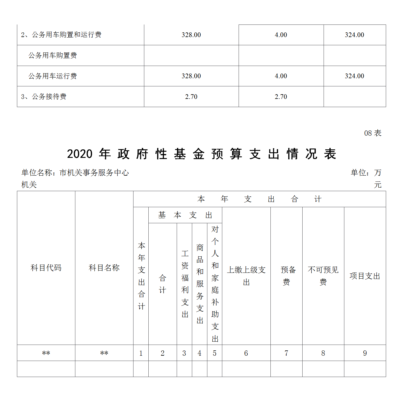 (三)“三公”经费预算编制情况:2020年,我中心安排“三公”经费预算330.70万元,比上年预算支出增加2.70万元,其中公务出国(境)费用0万元;公务接待费用2.70万元;公务用车运行及维护费用328万元(含机关公车运行及维修费预算4万元,公车保障中心车辆运行及维修费预算324万元)。详细明细如下: