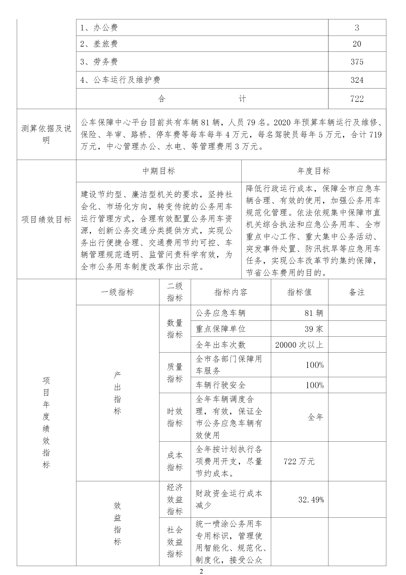 1、公车保障中心运行费 我市党政机关公务用车制度改革后,为积极做好公务用车保障工作。机关事务服务中心根据市委市政府年初下达的任务指标,重点保障11家具有执法职能单位、22家单位应急用车和全市重点中心工作保障用车。以及抢险救灾、事故处理、信访维稳、防汛抗旱等重点急难险重任务。2018年预算安排722万元,当年用于公务车辆购燃油、车辆维修、保险、年审、过路停车等费用316万元,用于公车保障中心司机工资、社保、公积金、福利费、值班补助、外出差旅补助等费用395万元,用于保障中心后勤人员办公、差旅、耗材等管理费用11万元。2020年保持预算722万元。