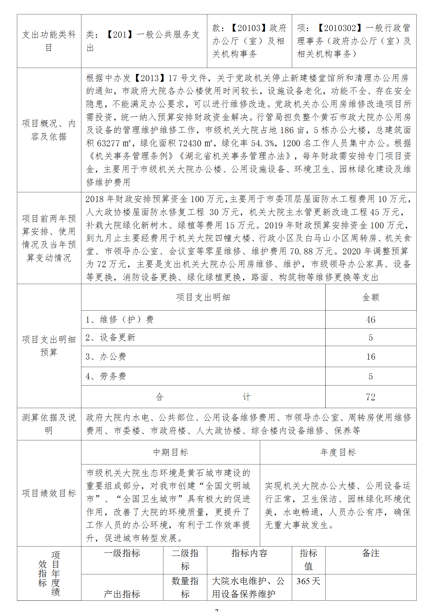 3、政府大院维修费用 根据中办发【2013】17号文件,关于党政机关停止新建楼堂馆所和清理办公用房的通知,市政府大院各办公楼使用时间较长,设施设备老化,功能不全、存在安全隐患,必须进行维修改造。党政机关办公用房维修改造项目所需投资,统一纳入预算安排财政资金解决。我中心担负整个黄石市政大院办公用房及设备的管理维护维修工作,市级机关大院占地186亩,5栋办公大楼,总建筑面积63277㎡,绿化面积72430㎡,绿化率54.3%,1500名工作人员集中办公。根据《机关事务管理条例》《湖北省机关事务管理办法》,每年财政应安排专门项目资金,用于市级机关大院办公楼、公用设施设备维修维护。2018年财政安排预算资金100万元,主要用于机关大院2018年的水管改造20万元,市委401会议室屋面防水10万元、更换中央空调20万元,市委、市政府、市人大政协办公楼挂牌8万元,白蚁防治12万元,机关食堂维修改造30万元。2020年财政预算72万元,主要用于政府大院内水电、公共部位、公用设备维修费用22万元;市委、市政府、人大政协共三幢大楼公共卫生间维修22万元,人大政协楼屋面防水工程14万元,机关大院消防监控工程更新改造14万元。