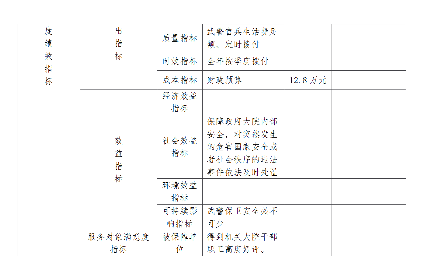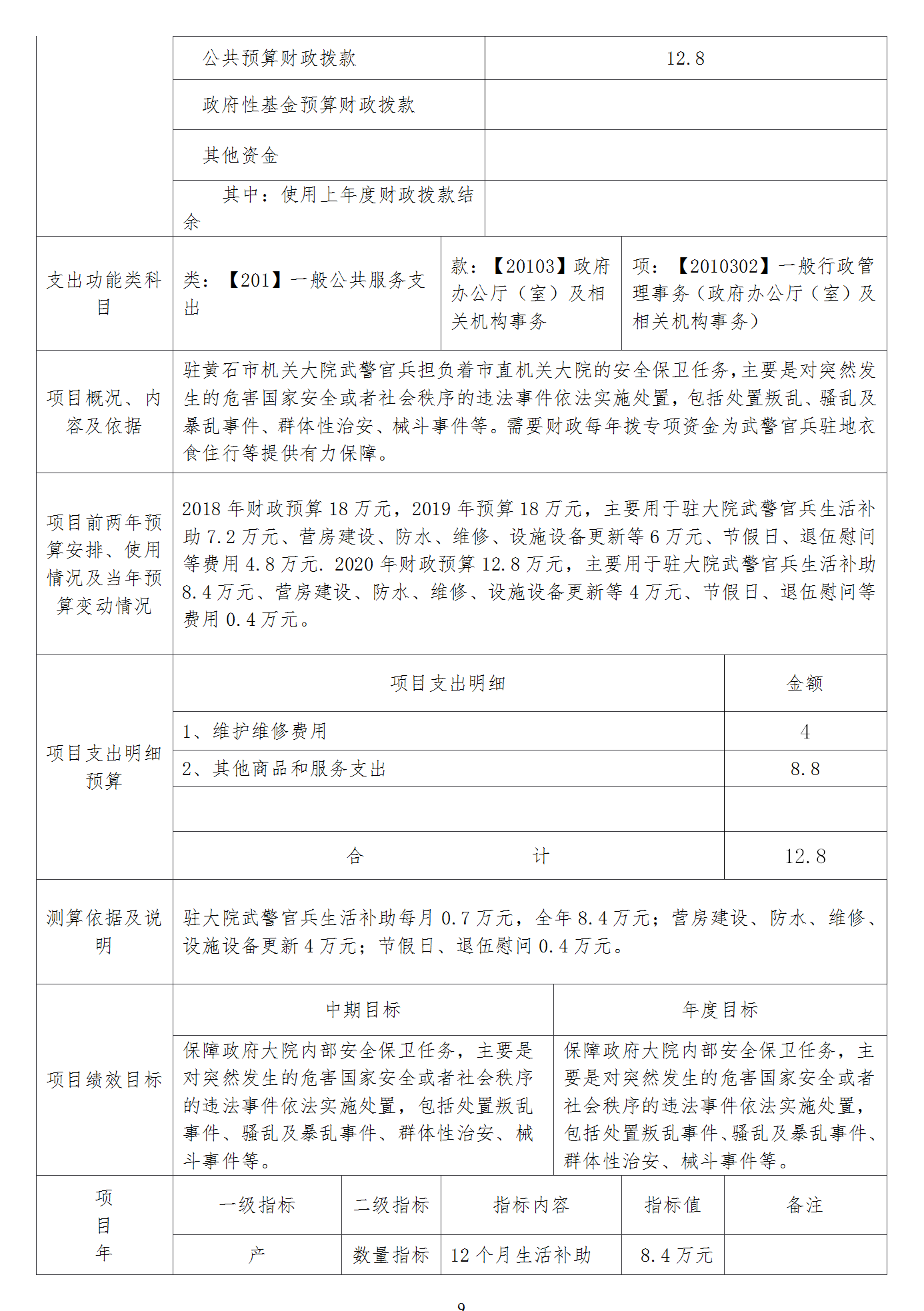 4、武警费用 驻黄石市机关大院武警官兵担负着市直机关大院的安全保卫任务,主要是对突然发生的危害国家安全或者社会秩序的违法事件依法实施处置,包括处置叛乱事件、骚乱及暴乱事件、群体性治安、械斗事件等。需财政每年拨专项资金为武警官兵驻地衣食住行等提供有力保障。2018年财政预算18万元,主要用于驻大院武警官兵生活补助7.2万元、营房建设、防水、维修、设施设备更新等6万元、节假日、退伍慰问等费用4.8万元;2020年财政预算安排12.80万元,主要用于驻大院武警官兵生活补助6万元、营房建设、防水、维修、设施设备更新等4万元、节假日、退伍慰问等费用2.8万元。