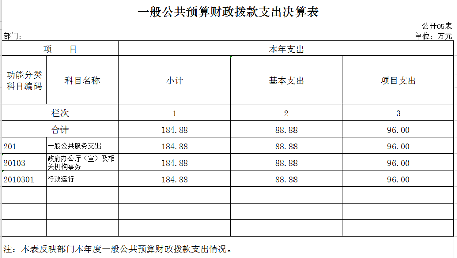 本年财政拨款收入184.88万元,财政拨款支出184.88万元,其中:人员经费支出73.33万元,日常公用经费支出15.55万元,项目经费支出96万元。