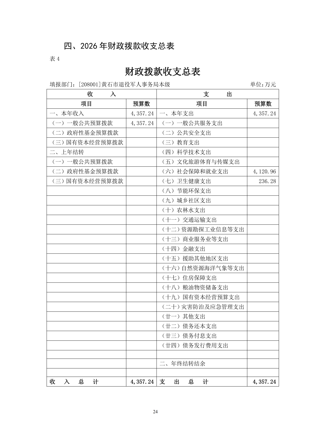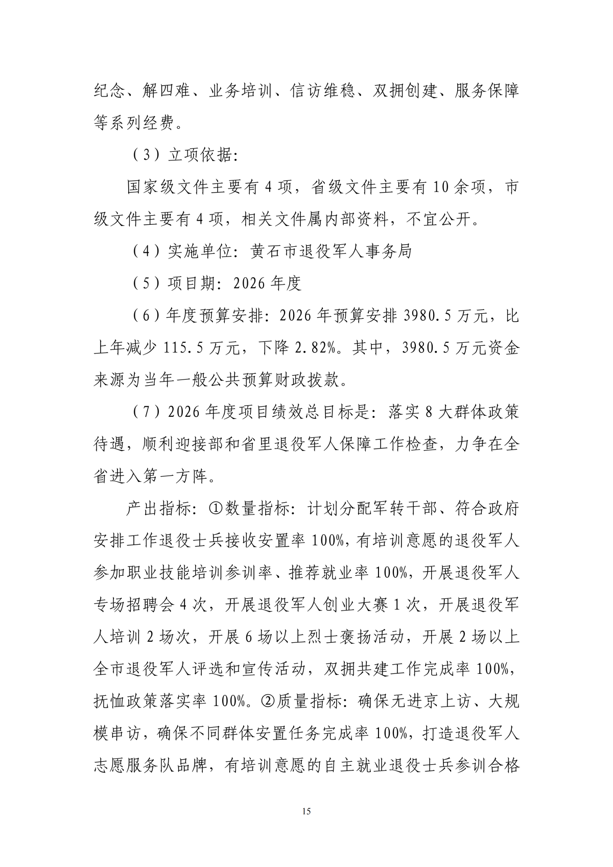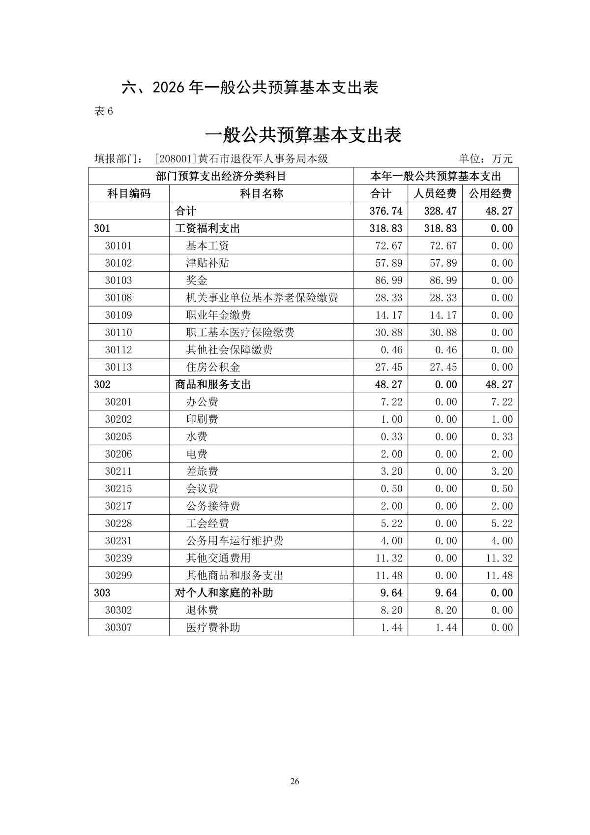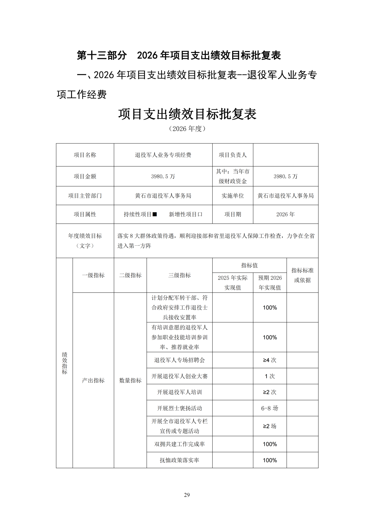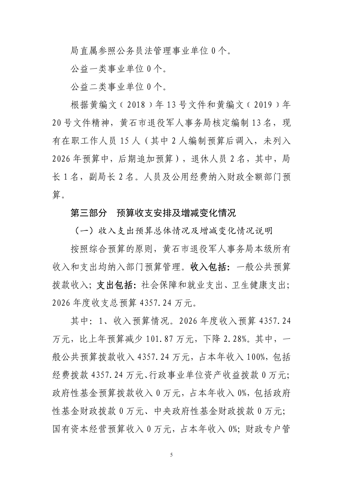 2026年度黄石市退役军人事务局本级部门预算公开情况说明