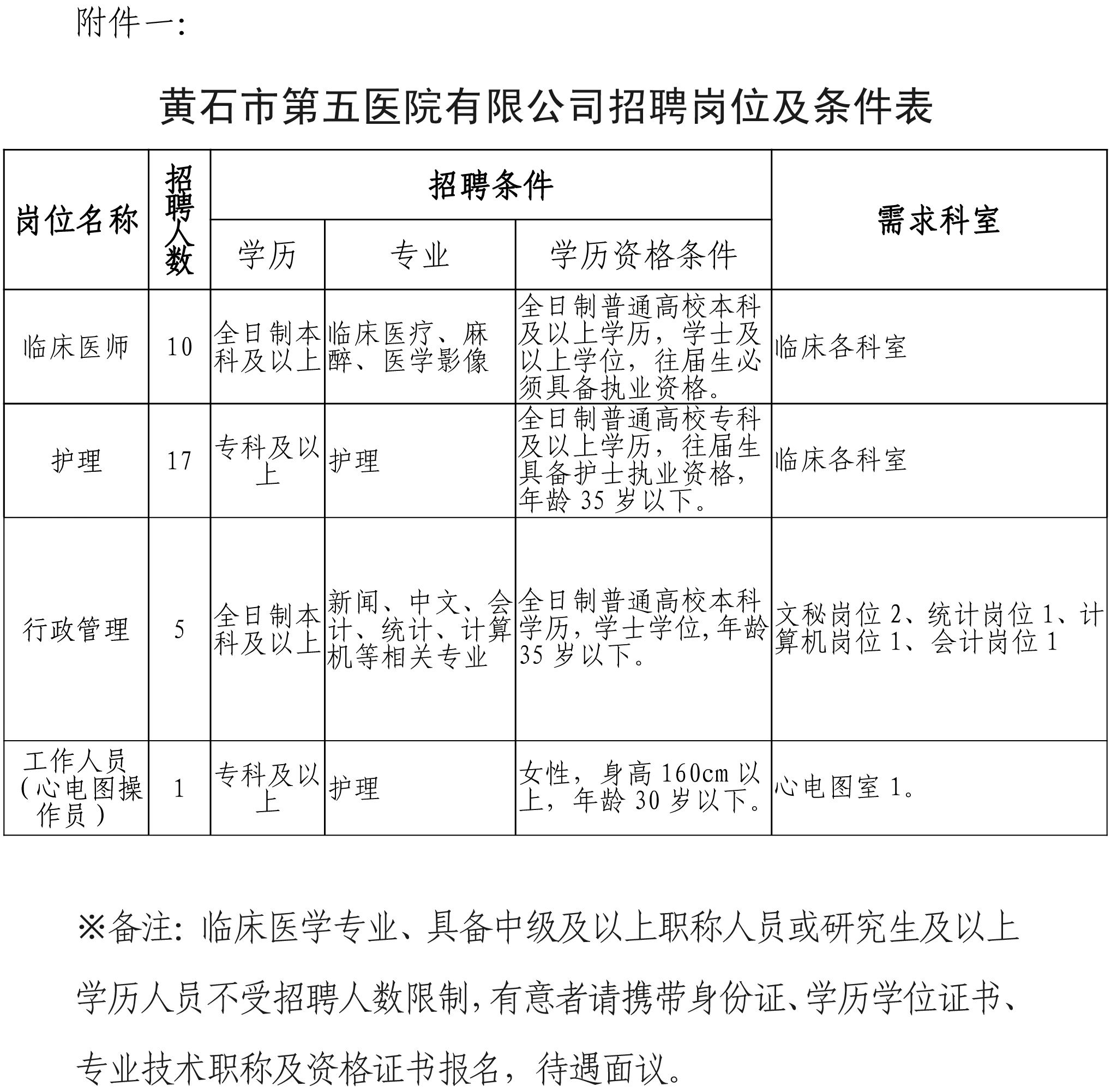 附件一:黄石市第五医院有限公司招聘岗位及条件表