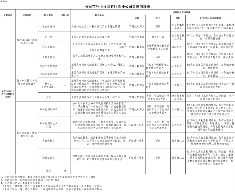 黄石市环境投资有限责任公司(以下简称公司)系黄石市城市发展投资集团有限公司所属单位,组建于2016年10月。主要承担黄石市环境治理项目的投融资及污水处理厂的运行管理,城镇及乡村污水处理、黑臭水体治理、工业废水处理、土壤修复、矿山治理、大气治理、中水回用、餐厨及建筑等废弃物处置、水环境检测等环保产业运营服务。注册资本2亿元,现有在册职工156人。公司下辖黄石环投污水处理公司、洁城检测公司等直属单位,出资参股市环投蓝德再生能源有限公司、市智慧环保科技有限公司等企业。根据公司发展需要,公司机关、下属单位环投污水处理公司、洁城检测公司面向社会公开招聘综合管理岗、工艺、设备管理员、操作工等各类专业人员16名,一经录用,待遇从优。