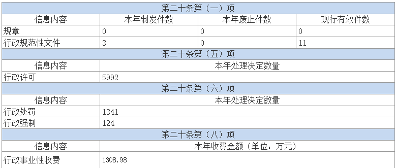 下表中行政许可、行政处罚、行政强制数据与行政执法年报同步。
